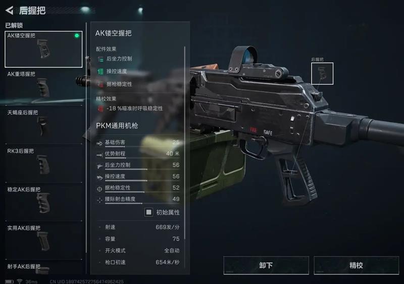 再来看握把,推荐使用AK镂空握把,它能增加操控速度,符合核心诉求。在精校时,建议增加配重,进一步提高后坐力控制。