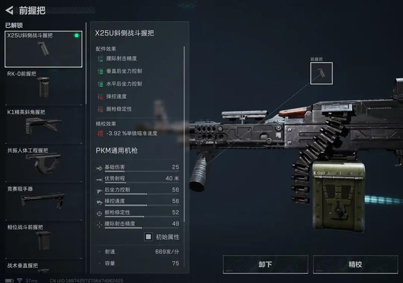 其次,前握把选择X25U斜侧战斗握把,其核心优势是同时增加垂直和水平后坐力控制,还能进一步增加腰射射击精度,适合频繁爆发贴脸距离战斗的据点争夺。虽然操控速度有所降低,但已由上述配件补偿,近距离战斗也不用过多追求握枪稳定性。精校时,可根据实战体验自行平衡数值,不必拘泥于改装方案上的具体数值。