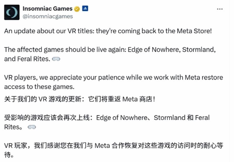 Insomniac Games今日发文回应其VR游戏下架一事,宣布受影响的游戏将重返Meta商店!