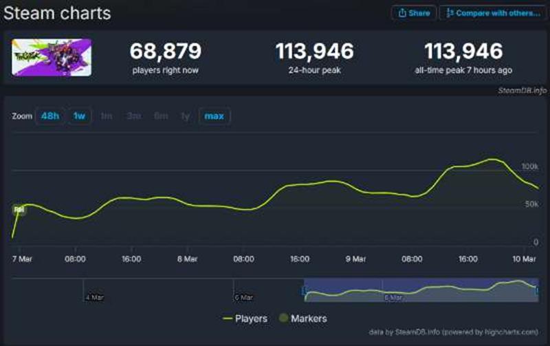 截至发稿前,《界外狂潮》在Steam平台的同时在线人数峰值已超过11万,未来或还会继续升高,且当前有近7万人正在游玩。