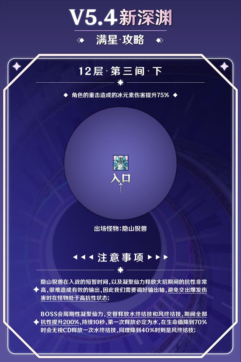 下半部分为隐山猊兽BOSS,具有高水抗性和风抗性(均为70%),不推荐使用水属性和风属性角色攻击。隐山猊兽会周期性凝聚仙力,交替释放水终结技和风终结技,期间抗性提升200%。水终结技可通过冻结后利用碎冰或融化反应解除;风终结技则需打破其周围的风球。队伍中需携带冰元素角色以应对水终结技,但无需额外携带水系角色。