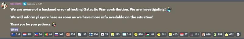 《绝地潜兵2》的银河战争再次因后端错误暂时停摆,这是短短几周内的第二次。3月9日中午,游戏社区经理Kathgerine “Baskinator” Baskin通过Discord发布消息,称开发团队发现了一个影响银河战争贡献的后端错误,正在紧急调查。