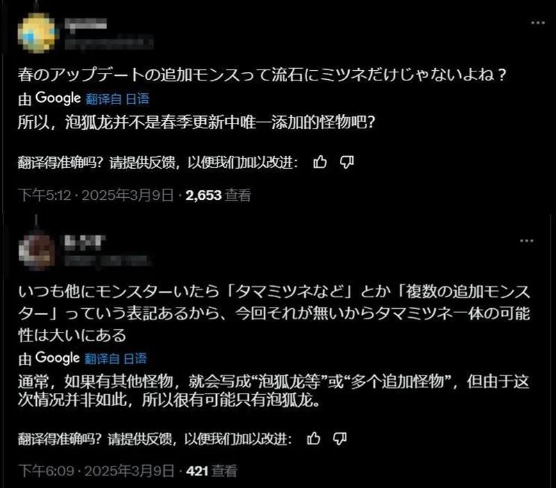 这一消息让玩家们充满期待,同时也激发了他们对新怪物身份的猜测。有玩家认为可能会加入本作中的第一条古龙,也有人猜测像“海龙”这样的人气封面怪或许会回归。然而,也有部分玩家对整个春季仅有泡狐龙一只新怪物表示不满,认为数量过于稀少。