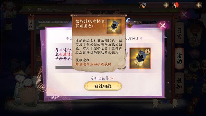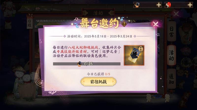 在活动期间,大人每日进行八岐大蛇御魂挑战并取得胜利后,将有几率掉落专属于即将降临的新联动角色的「技能升级素材碎片」,每日最多掉落5枚碎片,活动期间最多掉落25枚。