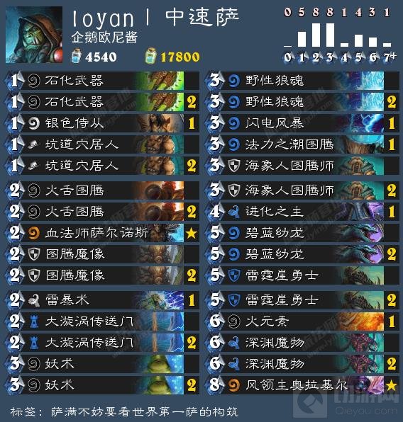 卡组介绍:loyan一直很喜欢中速萨的思路,这次新卡传送门的加入,让萨满有了低费无副作用的清场法术。所以这套牌还加入了以前中速萨必带的血法师。