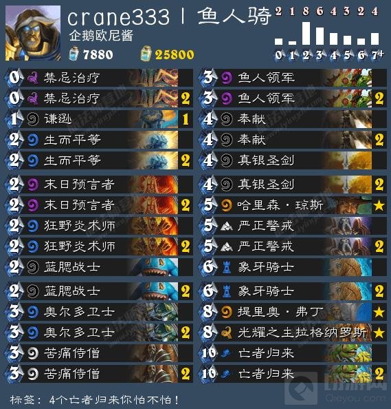 卡组介绍:鱼人骑算是蛮稳定的控制卡组,象牙骑士的加入让一回合奶10血,下回合30血带走对手再也不是梦。那么问题来,7条鱼的最高斩杀是多少?
