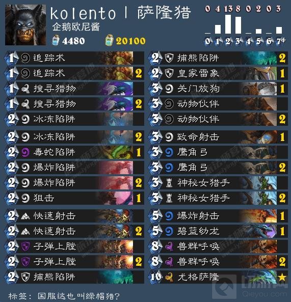 卡组介绍:直播时胜负参半,萨隆猎和正常的奥秘猎都是女猎手加入后有增益的卡组,原因也很简单,一群雄性兽人和动物之间突然来了个胸大的雌性,然后就描述不了了。