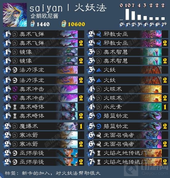 卡组介绍:又是一张强力的传送门,1费的奥术裸体的加入,随着法术的使用,屁股会越来越大,稳定站场。之后火妖法也可以不断射脸,让对手无可招架。