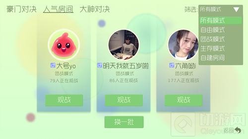 球宝们进入游戏中,点开主界面的“观战频道”,进入观战频道界面,然后选择“人气房间”,在这里的右上角,你会看到一个“筛选”图标,点击它的下拉菜单,里面就会出现所有模式、自由模式、生存模式、团战模式、生存模式、自建房间等5个选项,选择你想观看的模式即可。