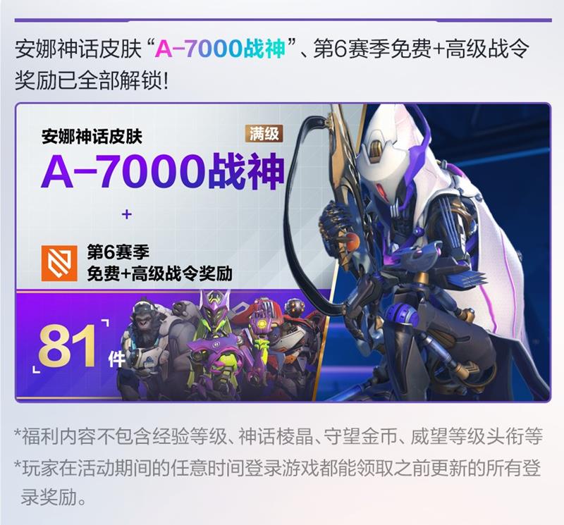 安娜神话皮肤“A-7000战神”(满级)、第6赛季免费+高级战令 奖励已全部解锁!