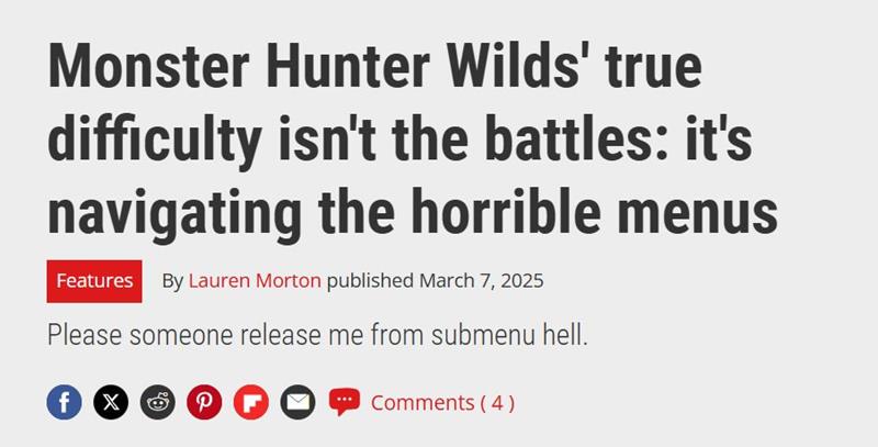 《怪物猎人:荒野》自发布以来已近两周,PC Gamer对此发表评论称,比起相对简单的战斗机制,游戏真正的难点在于其繁琐的菜单设计和不清晰的用户指引。