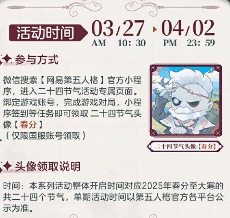 参与方式:微信搜索【网易第五人格】官方小程序,进入二十四节气活动专属页面。绑定游戏账号,完成游戏对局、小程序签到等任务即可领取二十四节气头像【春分】(仅限国服账号领取)。