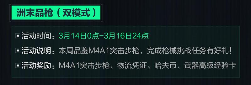活动奖励: M4A1突击步枪、物流凭证、哈夫币、武器高级经验卡