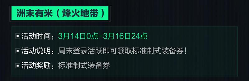 活动说明: 周末登录活跃即可领取标准制式装备券
