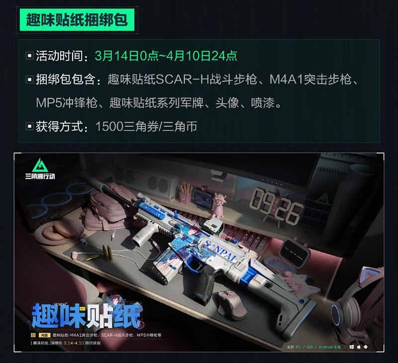捆绑包包含: 趣味贴纸SCAR-H战斗步枪、M4A1突击步枪、MP5冲锋枪、趣味贴纸系列军牌、头像、喷漆