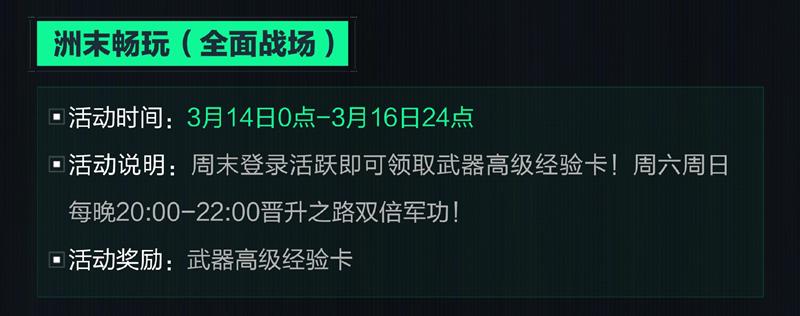 活动说明: 周末登录活跃即可领取武器高级经验卡!周六周日每晚20:00-22:00晋升之路双倍军功