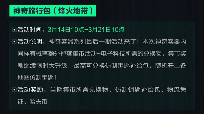 活动说明: 神奇容器系列最后一期活动来了!本次神奇容器内同样有概率额外掉落集市活动-电子科技所需的兑换物,集市奖励继续限时大升级,最高可兑换仿制钥匙补给包,随机开出各地图仿制钥匙