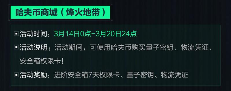活动说明: 期间,可使用哈夫币购买量子密钥、物流凭证、安全箱权限卡