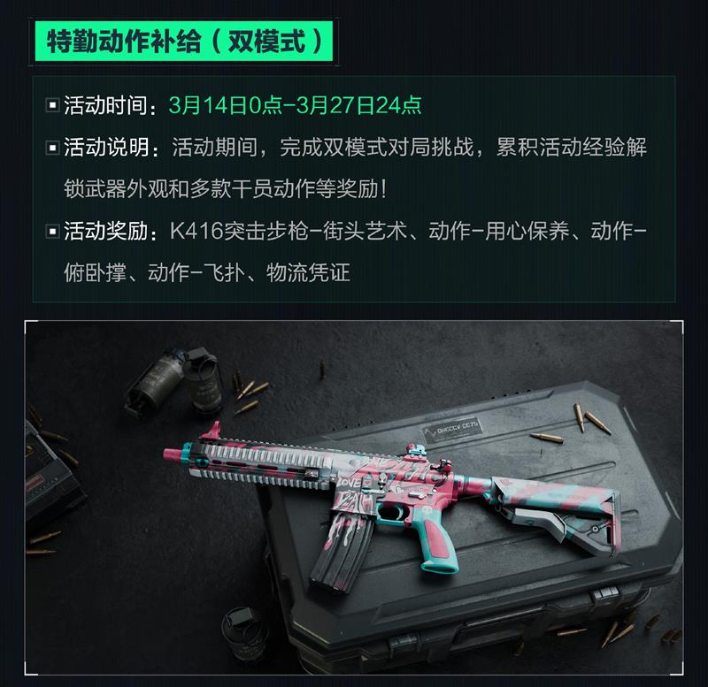 活动奖励: K416突击步枪-街头艺术、动作-用心保养、动作-俯卧撑、动作-飞扑、物流凭证