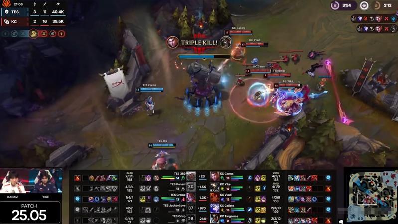 比赛前期,KC的艾翁和女坦配合默契,频繁入侵TES野区,压制了Kanavi的死歌发育。第22分钟,TES在大龙处决策失误,强行开龙却被KC抢走,随后KC凭借大龙Buff轻松推进,最终以2-0的比分锁定胜局。