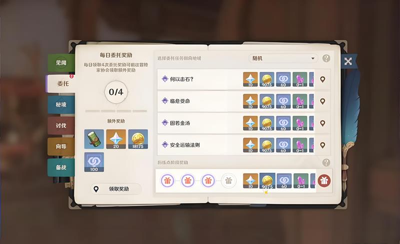 如果只算每日任务每日一个任务给250阅历,4个是1000,外加全完成凯瑟琳给500,一共1500。再加上每日自回体力(原萃树脂)每1点体力能获取5点冒险阅历,每8分钟恢复1点体力,因此每天最多180×5=900冒险阅历。