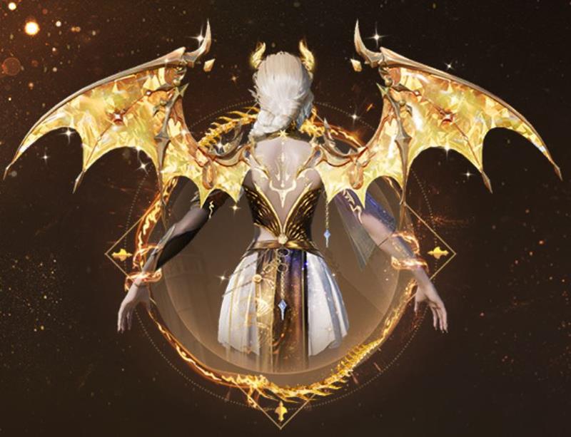 浅金色单侧麻花辫,尽显妩媚,自发间探出的小巧龙角。修身短裙与鎏金翅膀上流淌着金色流沙,熠熠生辉。