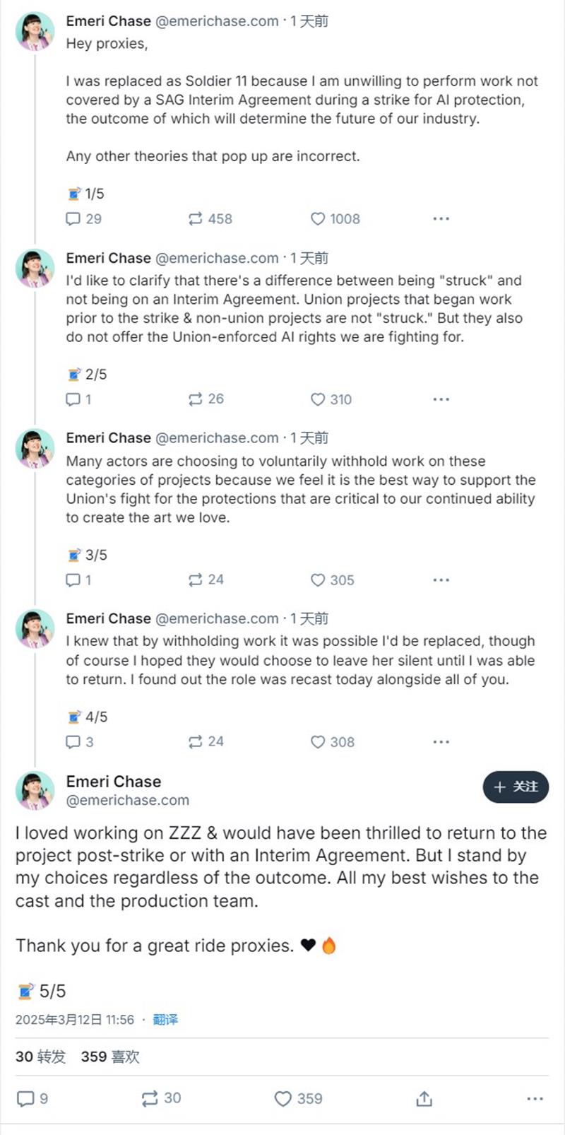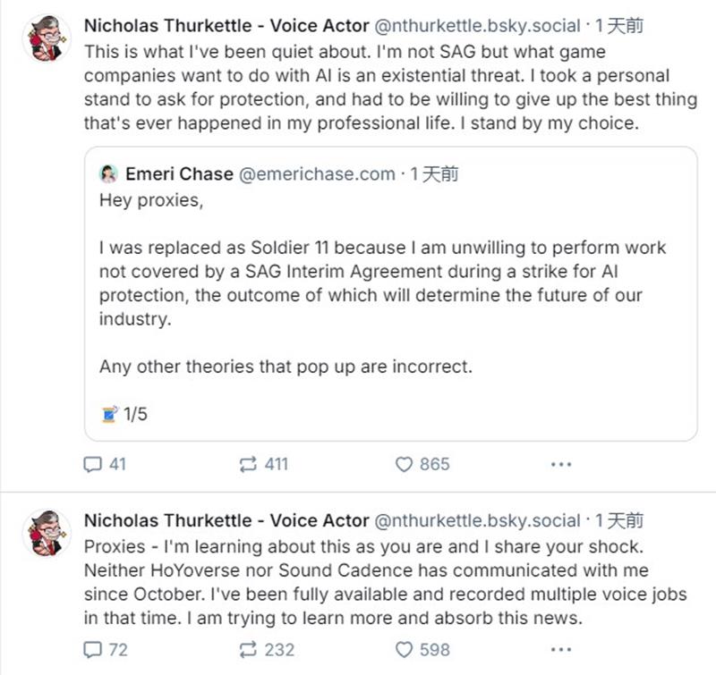 Emeri Chase在推文中表示,自己因拒绝在未签署SAG临时协议的情况下参与配音工作而被替换,她强调虽然《绝区零》在罢工前就开始开发,不受罢工直接影响,但配音演员们仍可自愿支持罢工行动,她选择支持工会争取AI保护的斗争,即使可能被替换,她依然坚持自己的选择。
