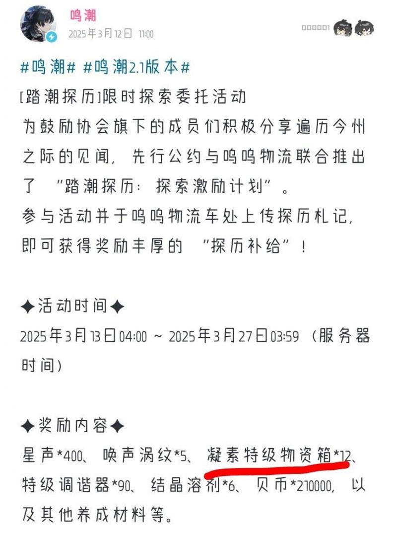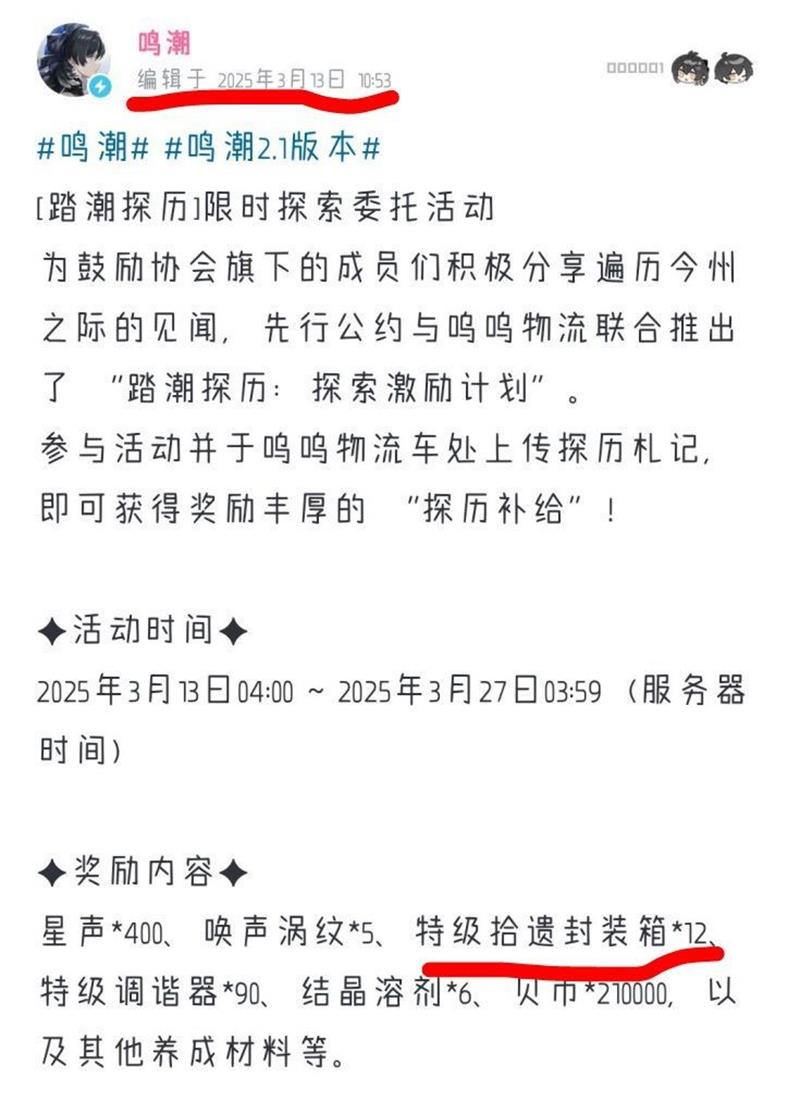 在《鸣潮》游戏中,近期出现了活动奖励与公告内容不符的情况。根据玩家反馈,B站公告以及游戏内公告中提及的活动奖励为“凝素特级物资箱”*12,然而实际游戏中发放的奖励却是“特级拾遗封装箱”。