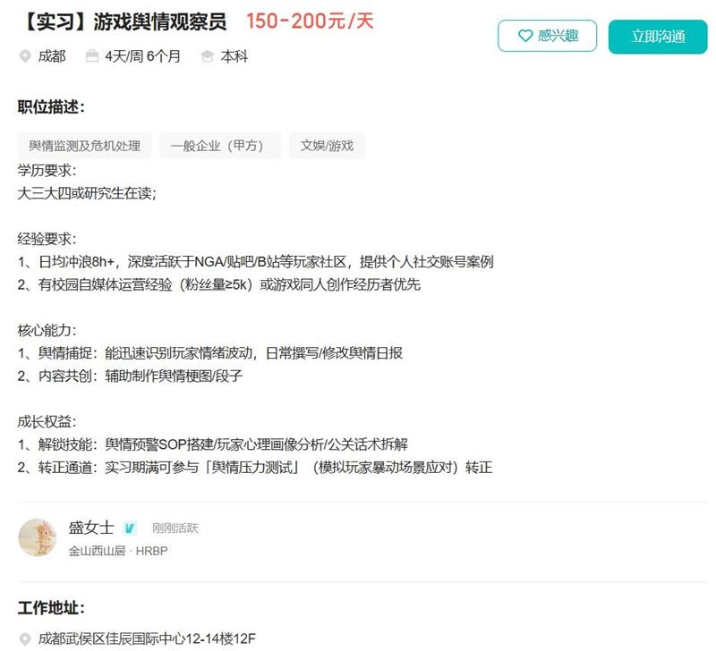 该岗位主要面向大三大四或研究生在读的学生,要求应聘者具备丰富的网络冲浪经验,日均活跃时间需达到8小时以上,并深度参与NGA、贴吧、B站等玩家社区。