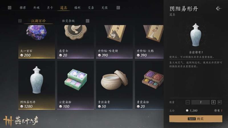 此外,阴阳易形丹将上架「江湖百珍商店」,游侠们可以通过1280长鸣珠购得。游侠们获得该道具后也可在背包中使用,或通过衣柜-更多选项中开启性别转换。
