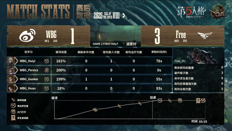 第二局比赛上半场Free战队的9U使用“跛脚羊”开局追击木偶师,教授利用鳞片稳定救援,最终Free监管者完成三抓。
