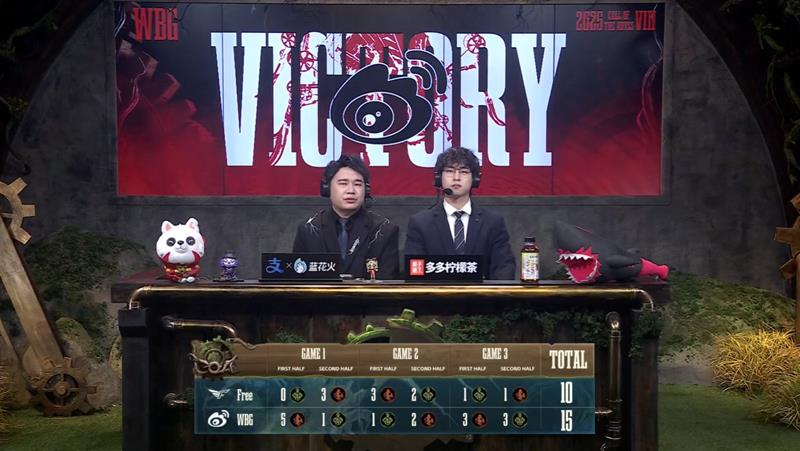 下半场WBG战队的Alex使用“跛脚羊”追击机械师,大副稳定救援,中期监管者利用牢笼快速击倒“骑士”,双方在三人开门战中极限拉扯,最终战至平手,总比分5比3,WBG再次获胜。