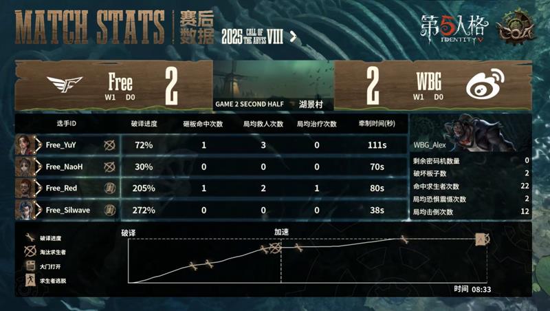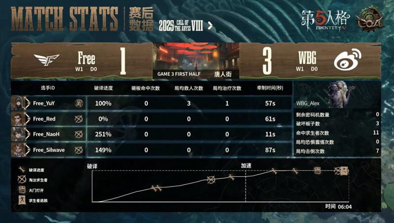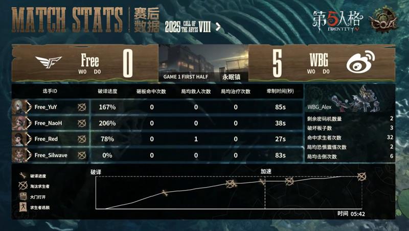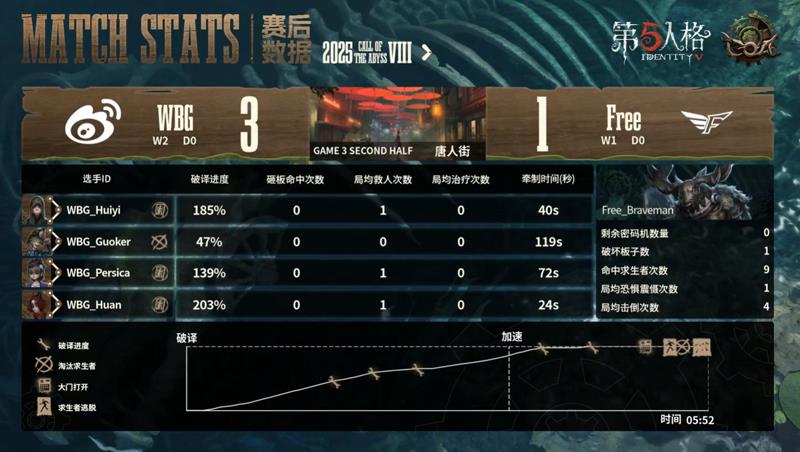 下半场Free战队的Braveman使用鹿头开局追击火灾调查员,火灾调查员多次灵活板区博弈为队友争取破译时间,最终WBG求生者完成三跑,WBG以2比6的比分赢得比赛,MVP选手为WBG的Alex。