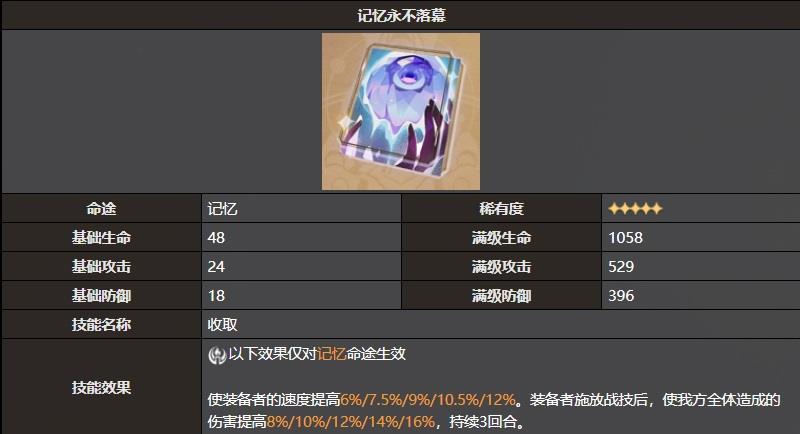 崩坏星穹铁道的光锥【记忆永不落幕】是一款五星记忆命途光锥,有着可以增加我方伤害与速度的效果,下面是这款光锥的详细信息,我们一起来看一看。