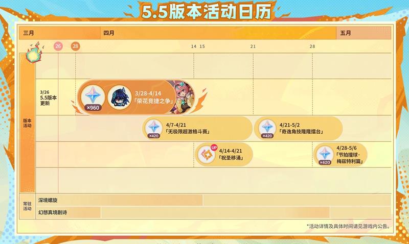 以上就是原神5.5版本的活动日程安排了,希望可以帮助到各位旅行者!如果这篇攻略对你有帮助,还请点个收藏关注一下切游网,各位读者的支持就是我们持续更新的最大动力。