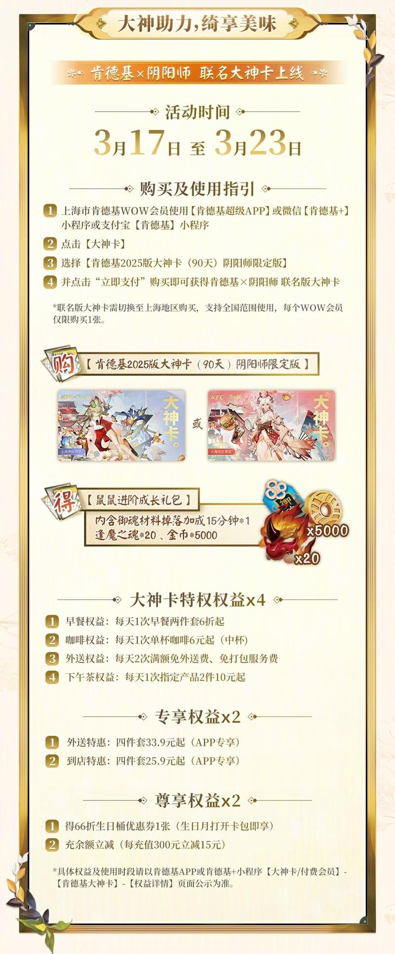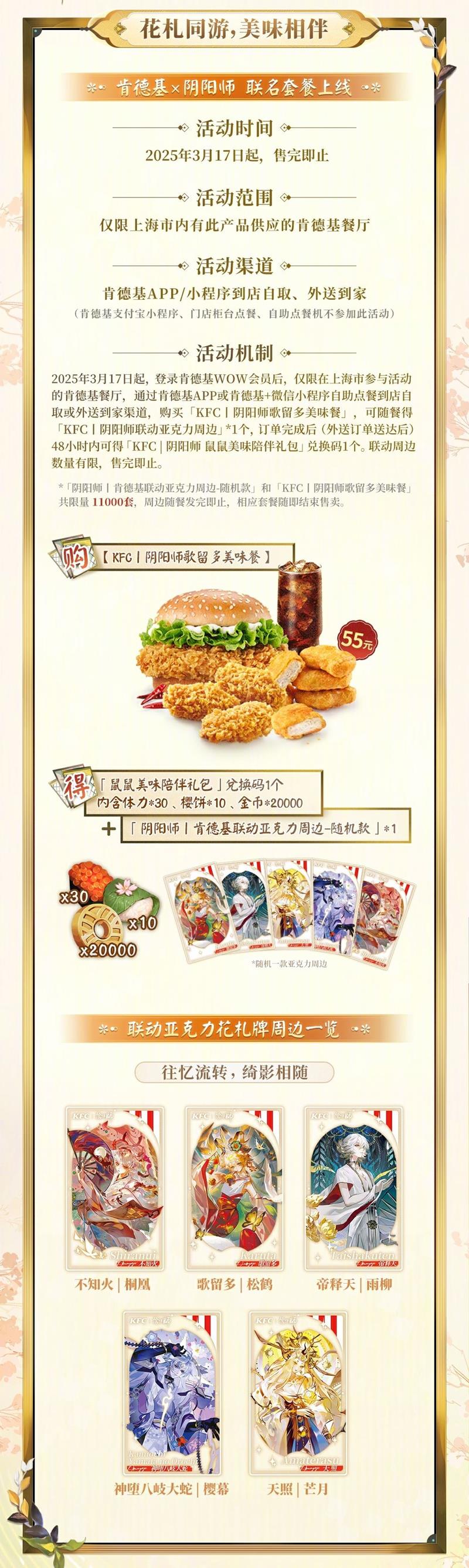 肯德基和阴阳师的联名活动公开了,可以在肯德基APP内购买限定大神卡和套餐参与联动活动。很多小伙伴想知道这次联动的范围,我们一起来看一下。