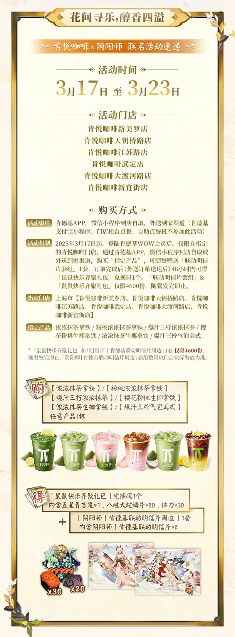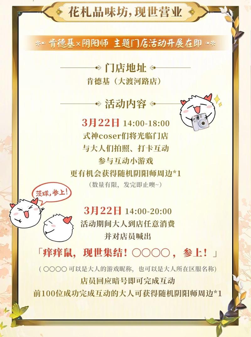 在肯德基的伤害大渡河路店,还将成为本次活动的主题门店,在3月22日,店内将会开启主题联动活动,完成活动可以获赠阴阳师周边,发完即止。
