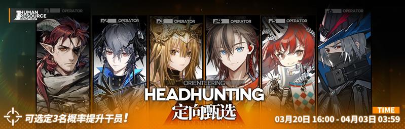 与此同时,“定向甄选”限时寻访活动也将于3月20日16时至4月3日3时59分开启。在这期间,博士们可在当期甄选的干员范围内自主选择并锁定3名六星干员和3名五星干员作为当期“定向甄选”寻访出现概率提升的干员。六星干员出率仍为2%,五星干员出率为8%。可选择概率提升的干员范围包括:六星干员赫德雷、逻各斯、维娜·维多利亚、白铁、焰尾、乌尔比安;五星干员绮良、灰毫、羽毛笔、晓歌、夏栎、海霓。