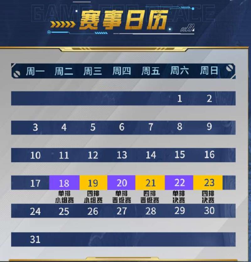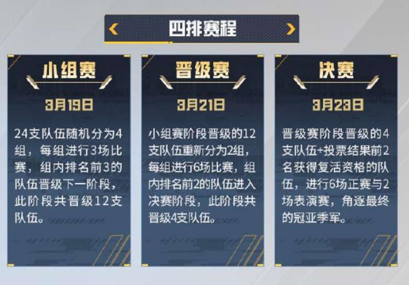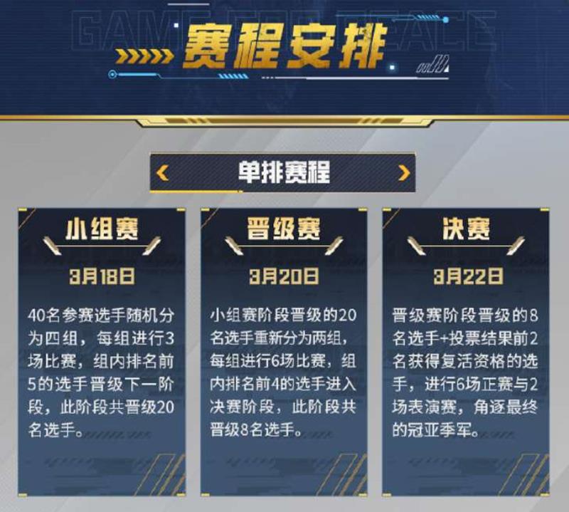 比赛将在3月18、20、22日将举行单排赛,而3月19日、21日、23日则进行四排赛。晋级赛成功晋级的队伍与选手,将在3月22日23日与投票复活的人气队伍与选手进行单排与四排赛最终的冠亚季军角逐之战。