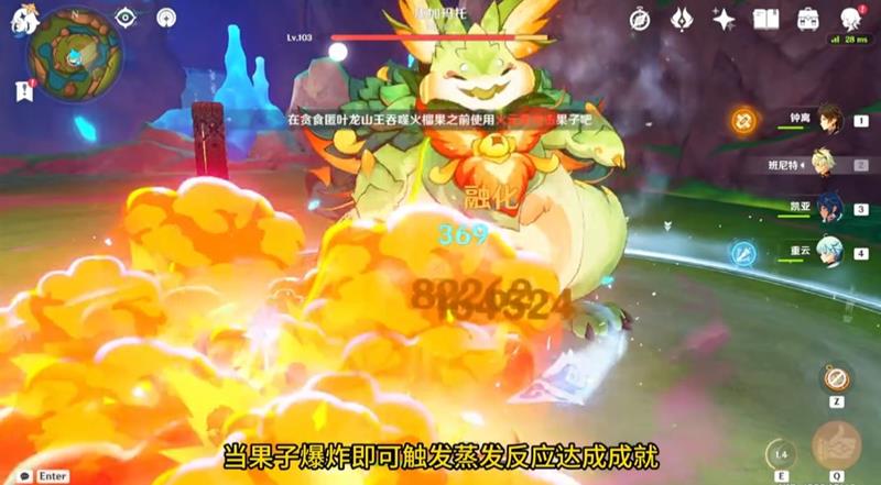 当贪食匿叶龙山王吐出火榴果的时候,我们开启冰系角色的技能保证其身上一直附带冰元素,然后小心地用火元素伤害引爆旁边的火榴果扎到贪食匿叶龙山王。这样就可以让火榴果爆炸对贪食匿叶龙山王造成融化伤害,成就解锁。