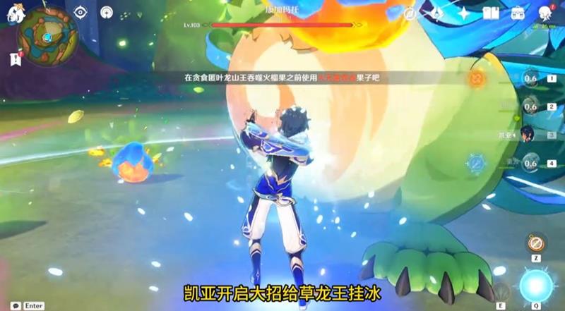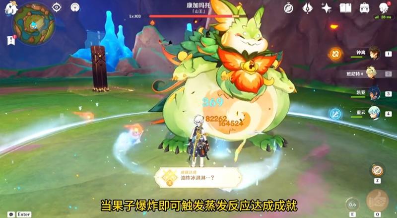 原神的油炸冰淇淋成就需要让火榴果爆炸对贪食匿叶龙山王造成融化伤害。为此我们需要先给BOSS挂上冰元素再引爆火榴果。