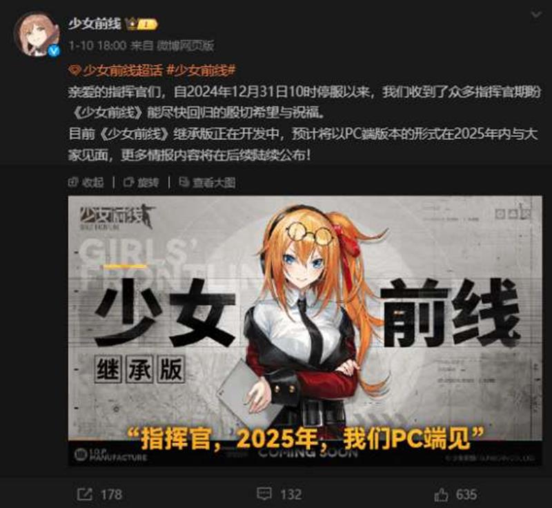 《少女前线》国服版已于2024年12月31日正式停止运营,此前,官方表示《少女前线》继承版正在紧锣密鼓的开发中。而官方于2025年3月17日宣布,备受玩家期待的《少女前线》继承版将于2025年夏季正式上线,并登陆Steam平台。