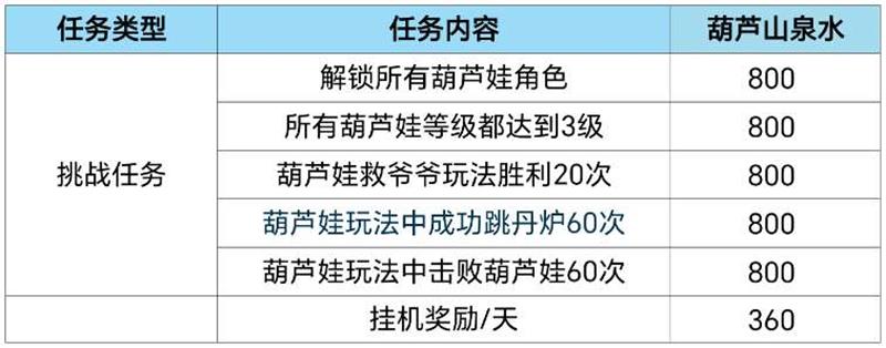 挑战任务每人每个账号只能完成一次,完成任务后可以获取葫芦山泉水*800。这些奖励力度较大。需要大家解锁葫芦娃角色、提升葫芦娃等级、进行多场对局后才能全部完成!