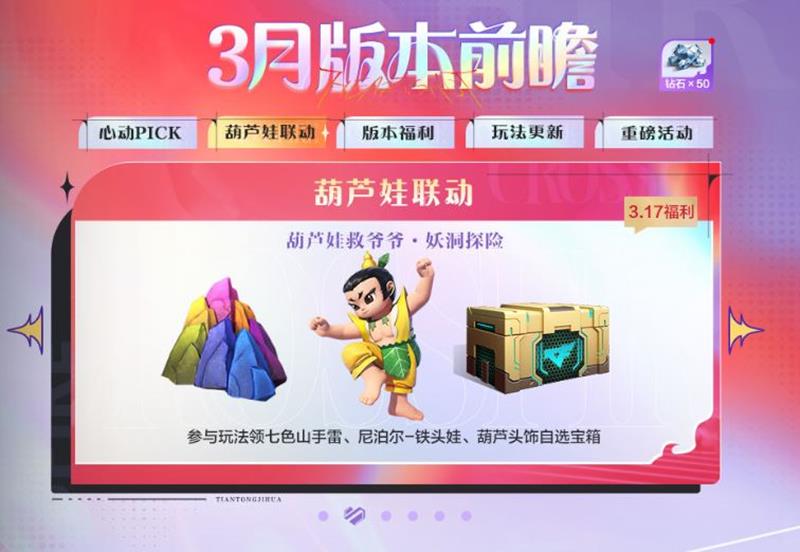 葫芦娃联动玩法活动的持续时间为3月17日~4月30日,一共持续45天,各位小伙伴有充足的时间来完成活动任务。大家可以在游戏大厅的右下角虹之协奏曲右边的玩法先锋页面点击进入该活动。