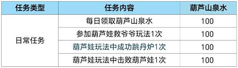 在该活动中,我们可以完成日常任务、每周任务、挑战任务等三种任务领取葫芦山泉水,当葫芦娃泉水累计到一定值就可以提升葫芦等级以领取对应奖励。此外,该活动还有特殊的挂机奖励。它会随着玩家在线时间累计叠加,累计速度为360葫芦山泉水/天。