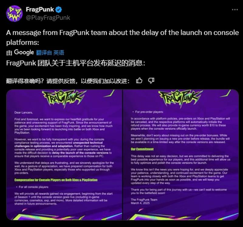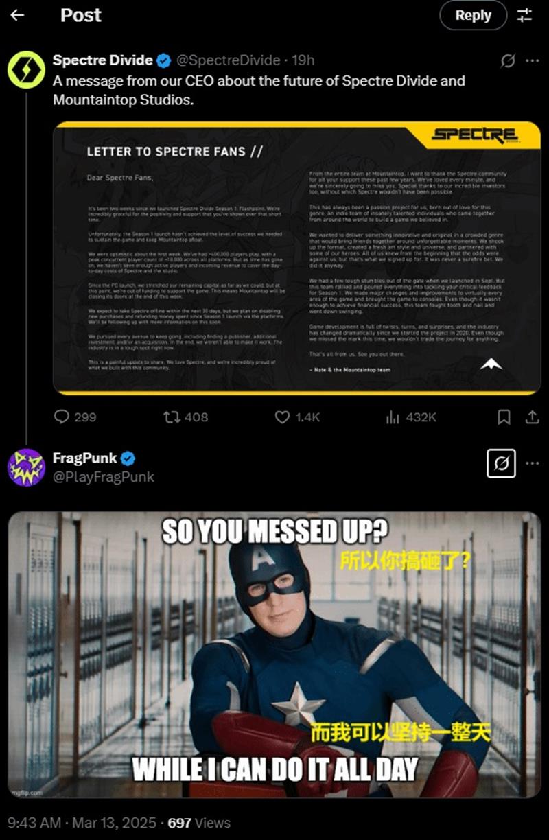 然而,在这一背景下,网易战术FPS新作《界外狂潮》的开发商Bad Guitar Studio却在Mountaintop的公告下方,通过FragPunk的官方社交账户发布了一个美国队长的表情包,暗示是Mountaintop“搞砸了”导致他们的游戏关闭,而《界外狂潮》的寿命将会更长。这一行为引发了争议,随后该工作室删除了该评论,并发表道歉声明,称这一评论是“麻木不仁且不专业”的,没有反映他们工作室的价值观或对同行的尊重。