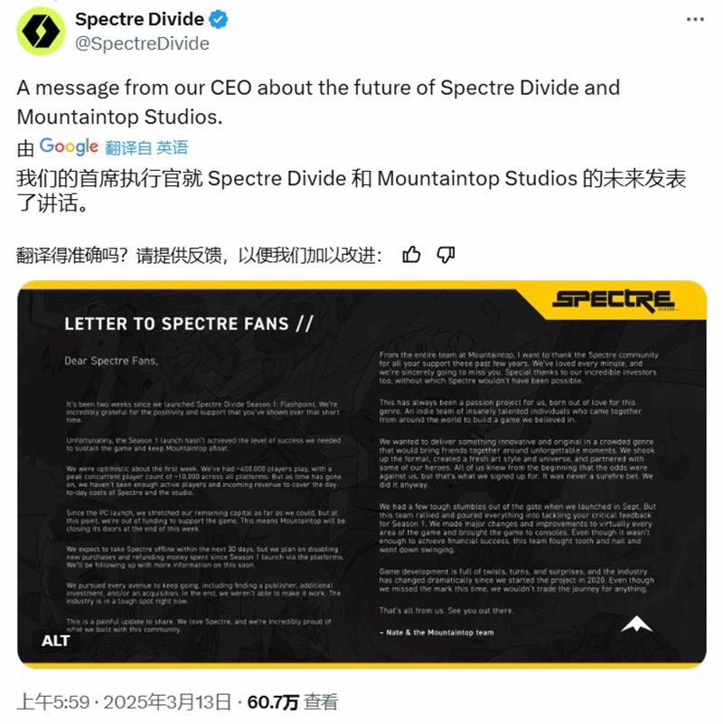 近日,开发商Mountaintop Studios于本周早些时候宣布,由于未能在对应市场吸引到足够多的玩家,其处女作《Spectre:Divide》将在未来30天内关闭服务器。