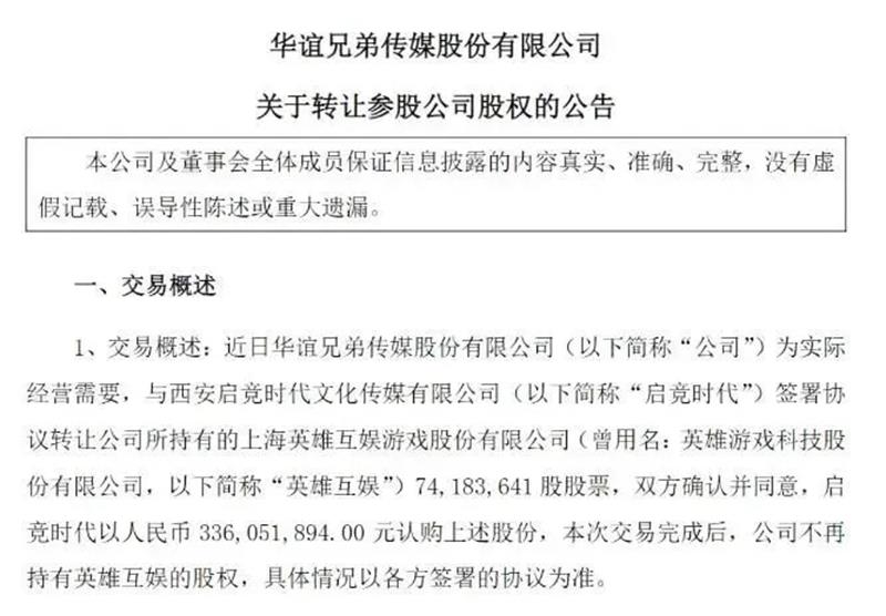 华谊兄弟近日发布公告,计划以4.53元每股的价格,向西安启竞时代文化传媒有限公司,转让英雄互娱5.17%的股份,交易总价为3.36亿元。