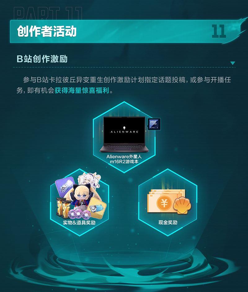 创作者活动中,引航者们参与B站卡拉彼丘异变重生创作激励计划指定话题投稿,或参与开播任务,即有机会获得Alienware外星人实物&道具奖励、现金奖励。同时,参与FANBOOK卡拉彼丘创作者激励计划完成激励者日常任务,亦有机会获得丰厚奖励。