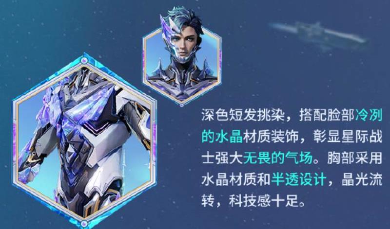 深色短发挑染,搭配脸部冷冽的水晶材质装饰,彰显星际战士强大无畏的气场。胸部采用水晶材质和半透设计,晶光流转,科技感十足。